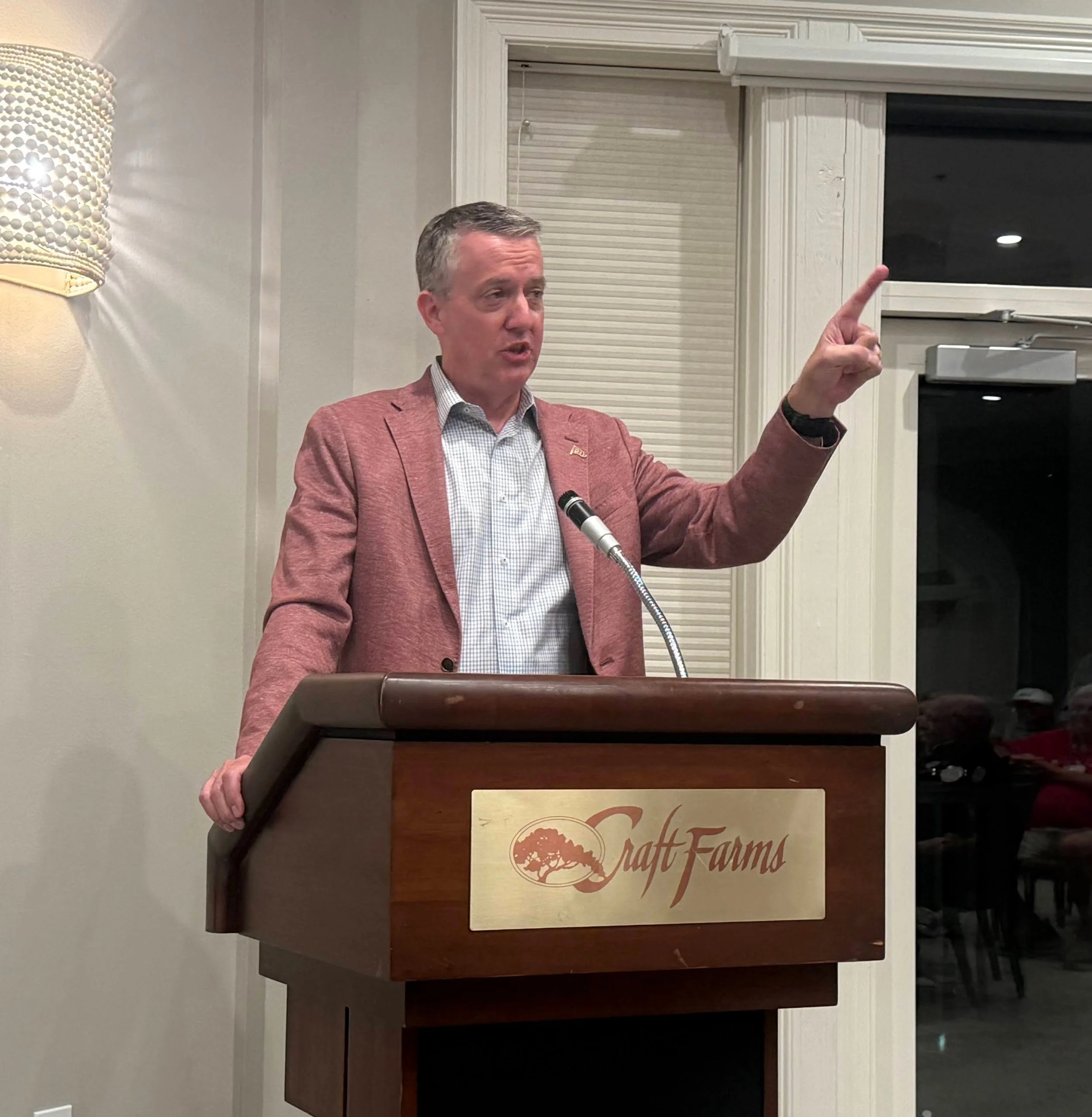 The Gulf Coast Athletic Club started its new season and opened its August 25, 2025 meeting in the Clubhouse at Craft Farms Golf Resort at 6:58pm. Returning President George Autrey welcomed the crowd of 75 attendees as our Football Family. Guest were introduced, including Mayor Robert Craft.