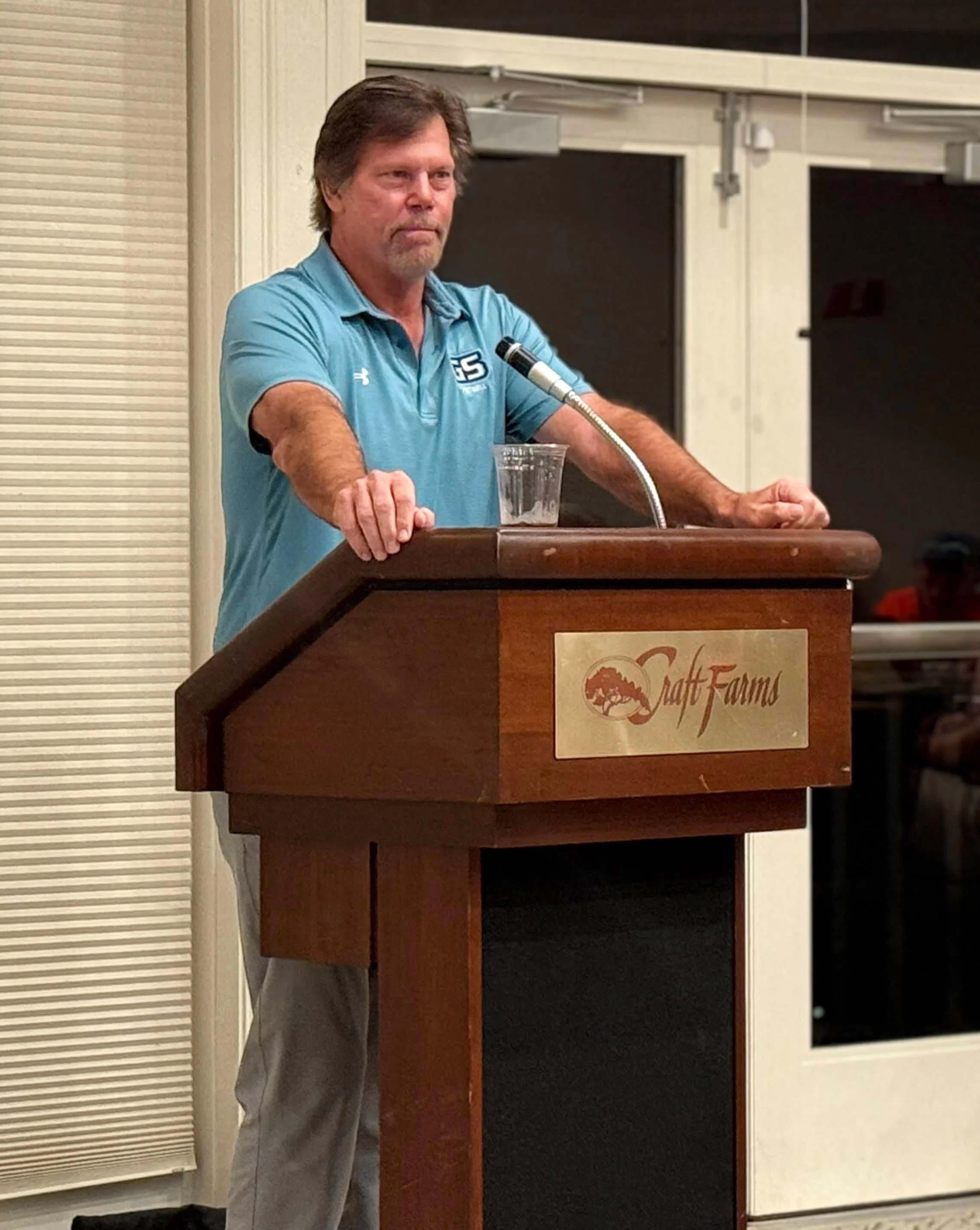 Kevin then introduced our Guest Speaker, Brian VanGorder, currently in his second stint as the Defensive Coordinator at Gulf Shores High School. Brian discussed his upbringing in Detroit, how fortunate our students are to be in a place like GS, his passion for sharing life lessons with the kids and teaching the game we all love. Coach VanGorder spoke about his life path, which took him from playing in the shadows of Detroit auto plants the auto-plants to the highest level of coaching at places like Auburn, Georgia, Notre Dame, Atlanta Falcons, Jacksonville Jaguars, among others. We are fortunate to have a gentleman with his credentials, abilities, and tenacity coaching and leading our Dolphin defensive efforts.