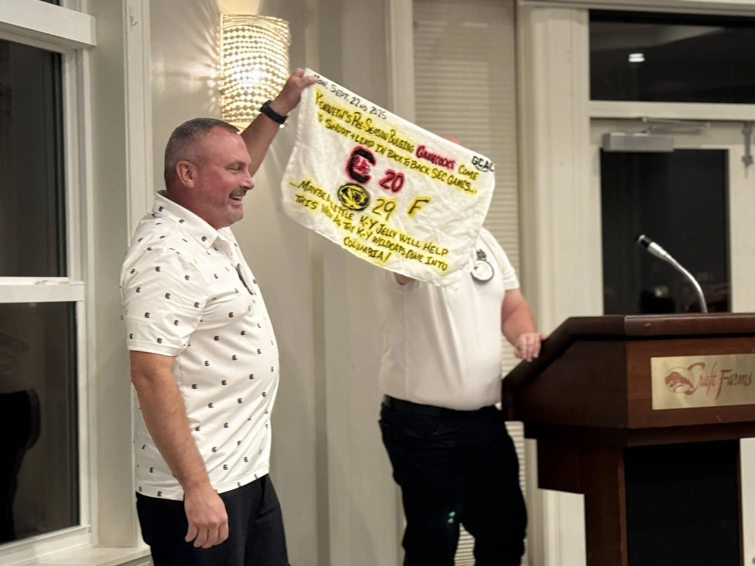 Team Reports, led by Dec McClelland, were a hit as usual, with over 20 teams weighing in. The Crying Towel Committee awarded the towel to South Carolina, for their back-to-back losses against Vandy and Missouri. Kenneth Jones graciously accepted the towel on behalf of his team.