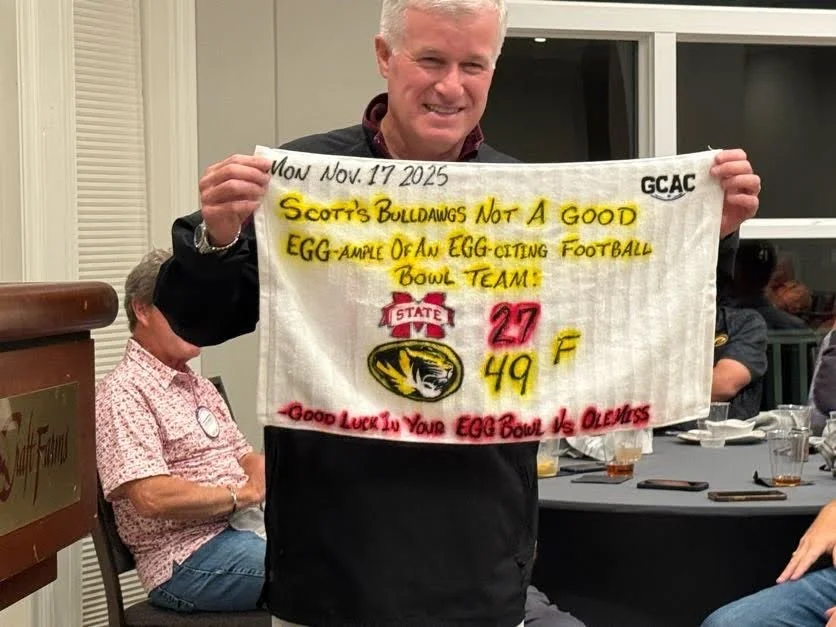 The Gulf Coast Athletic Club held its November 17, 2025 meeting at the Craft Farms Golf Resort. Nice to be back on Monday night. GCAC President George Autrey welcomed the crowd of about 70 football fans at 7:00pm. Introductions of guests ensued. Must be getting close to an election since we had several candidates present, including former Congressman Jerry Carl, Baldwin County Sheriff Anthony Lowery, Baldwin County Commissioner candidate Angelo Fermo, and our Speaker!